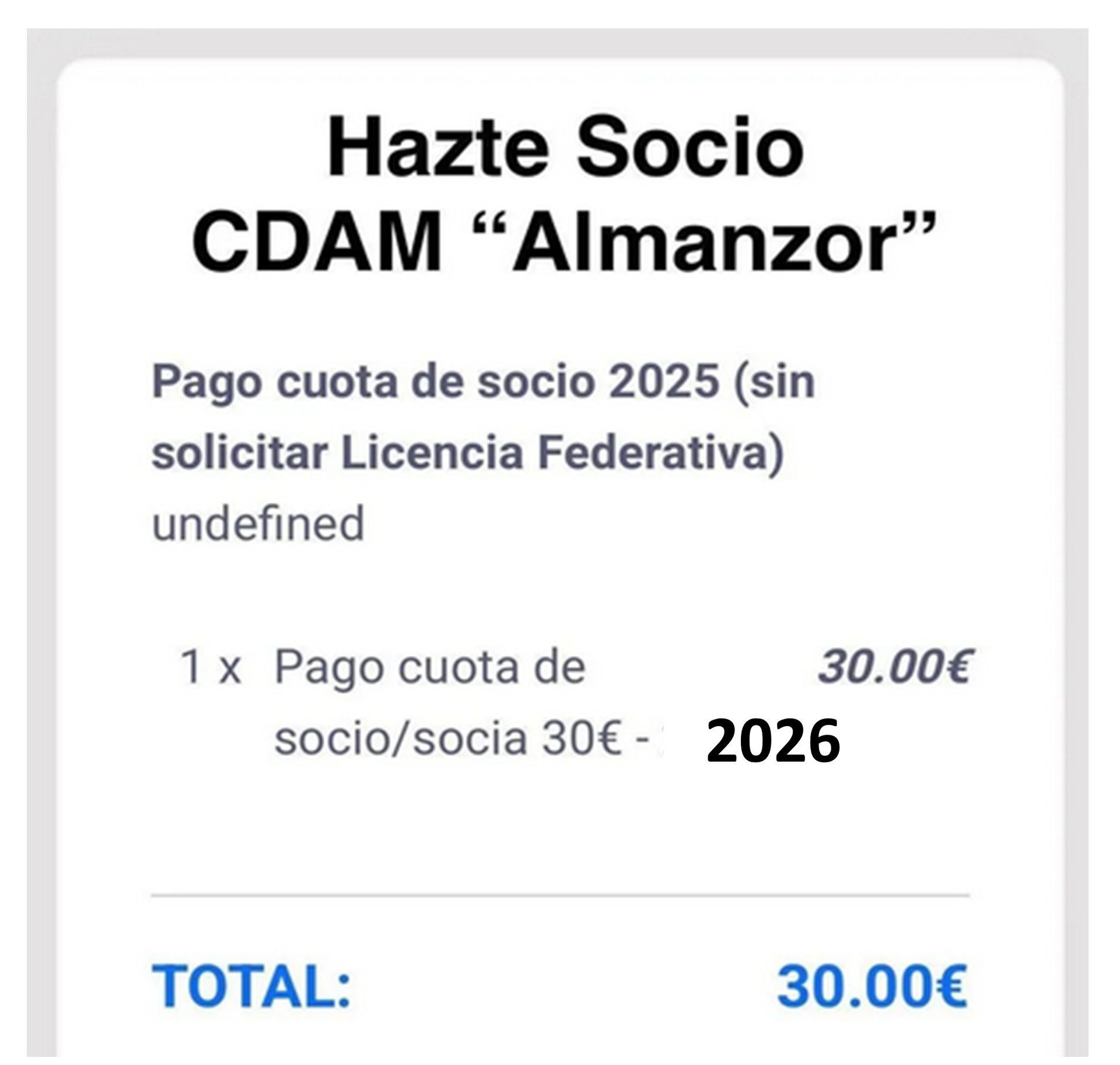 si quieres pagar la cuota de socio 2026 SIN solicitar la licencia federativa